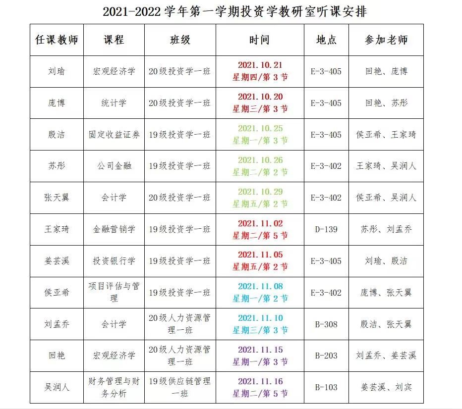 10月21-11月16日,投资学教研室开展了全员听课活动。在这次活动中,全体教师认真对待积极参与,显示了很高的教研热情,促进了教学工作的顺利进行。11月17日下午,投资学教研室将这次活动总结回顾。