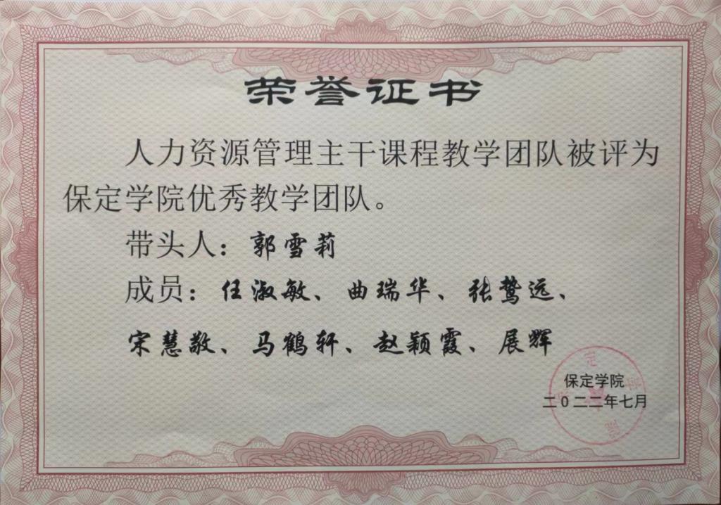 团队始终秉持“以员工为中心 ”的教学理念,聚焦立德树人根本任务,深化教学改革,团队承担国家级一流课程一门,校级一流课程一门,获教学成果奖五项。团队成员积极开展教学创新,运用混合式教学、项目式教学等模式,推动课堂质量提升。