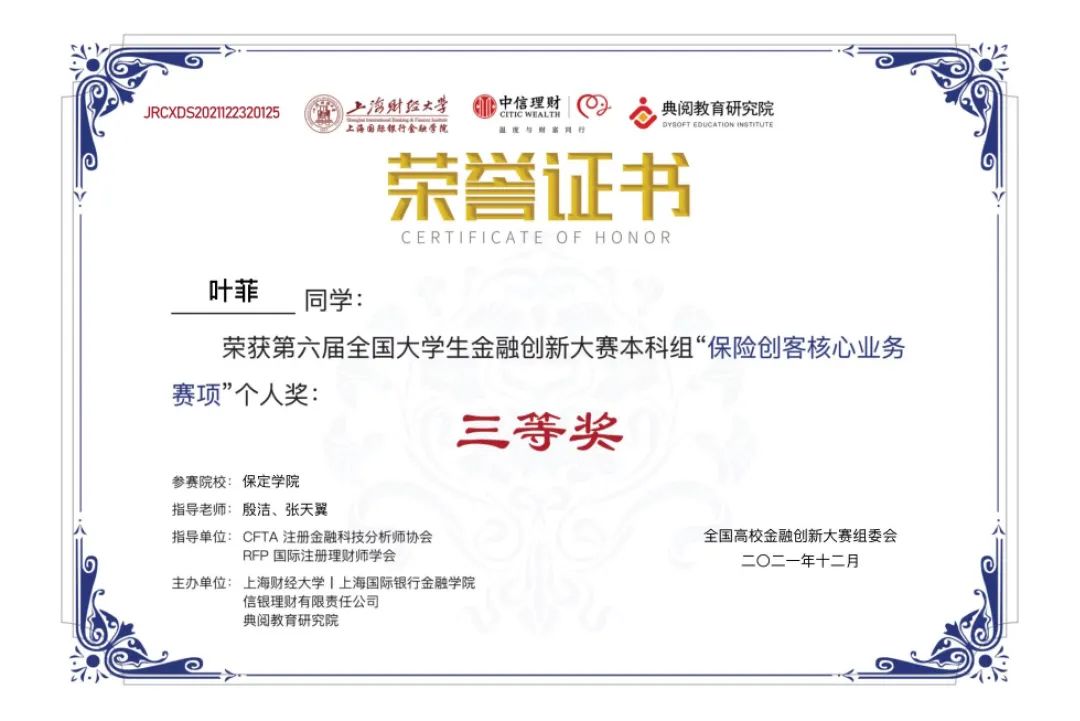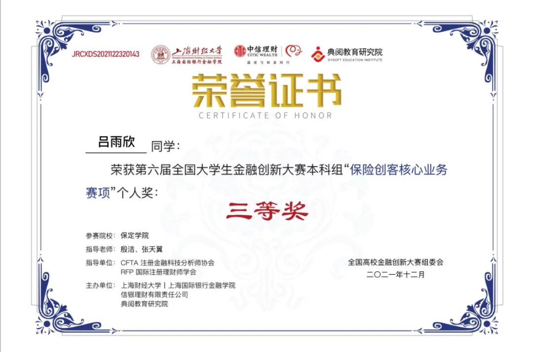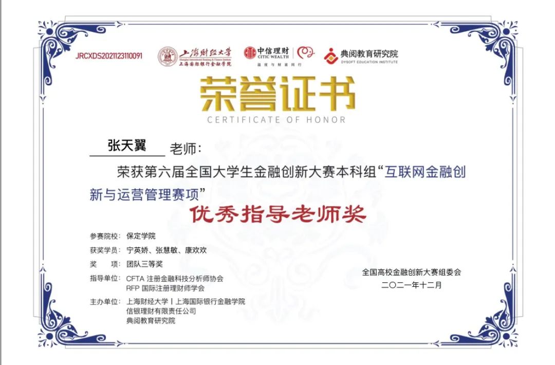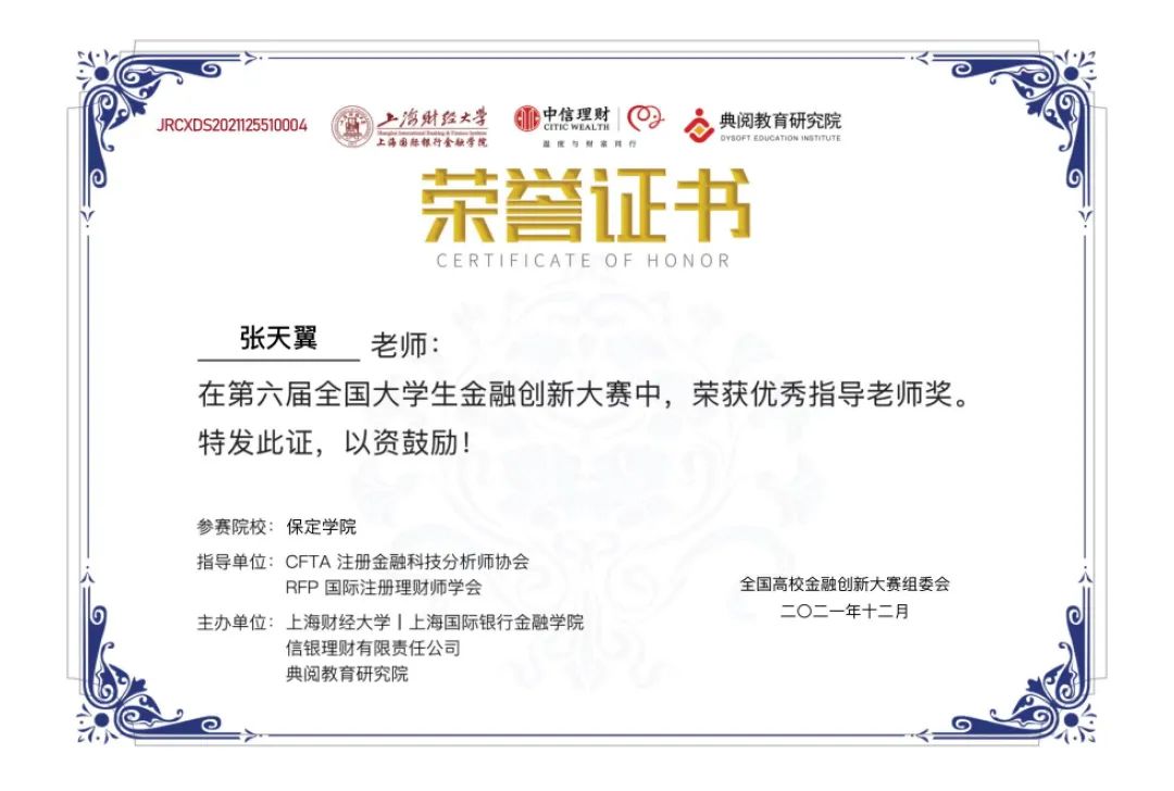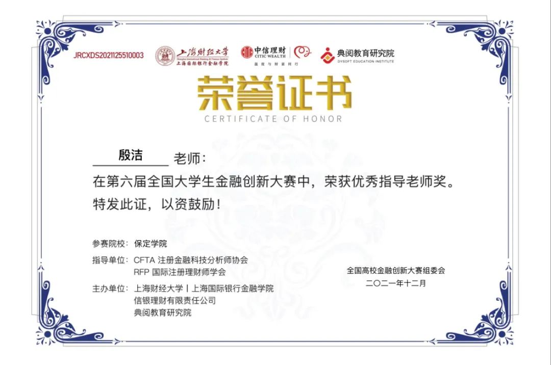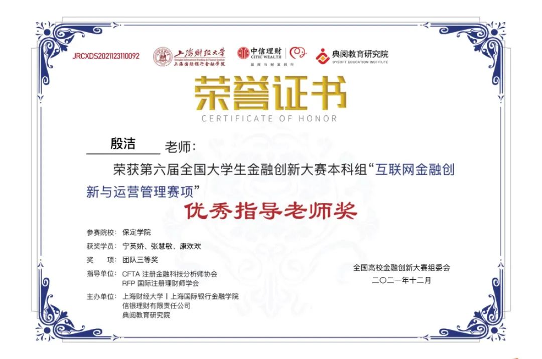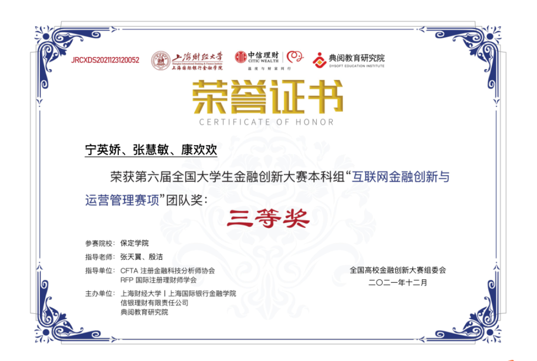 近日,由全国高校金融创新大赛组委会牵头举办,上海财经大学上海国际银行金融公司、信银理财有限责任公司、典阅教育研究院主办,CFTA注册金融科技分析师协会和RFP国际注册理财师学会联合担任指导单位的第六届全国老员工金融创新大赛全国总决赛落下帷幕。